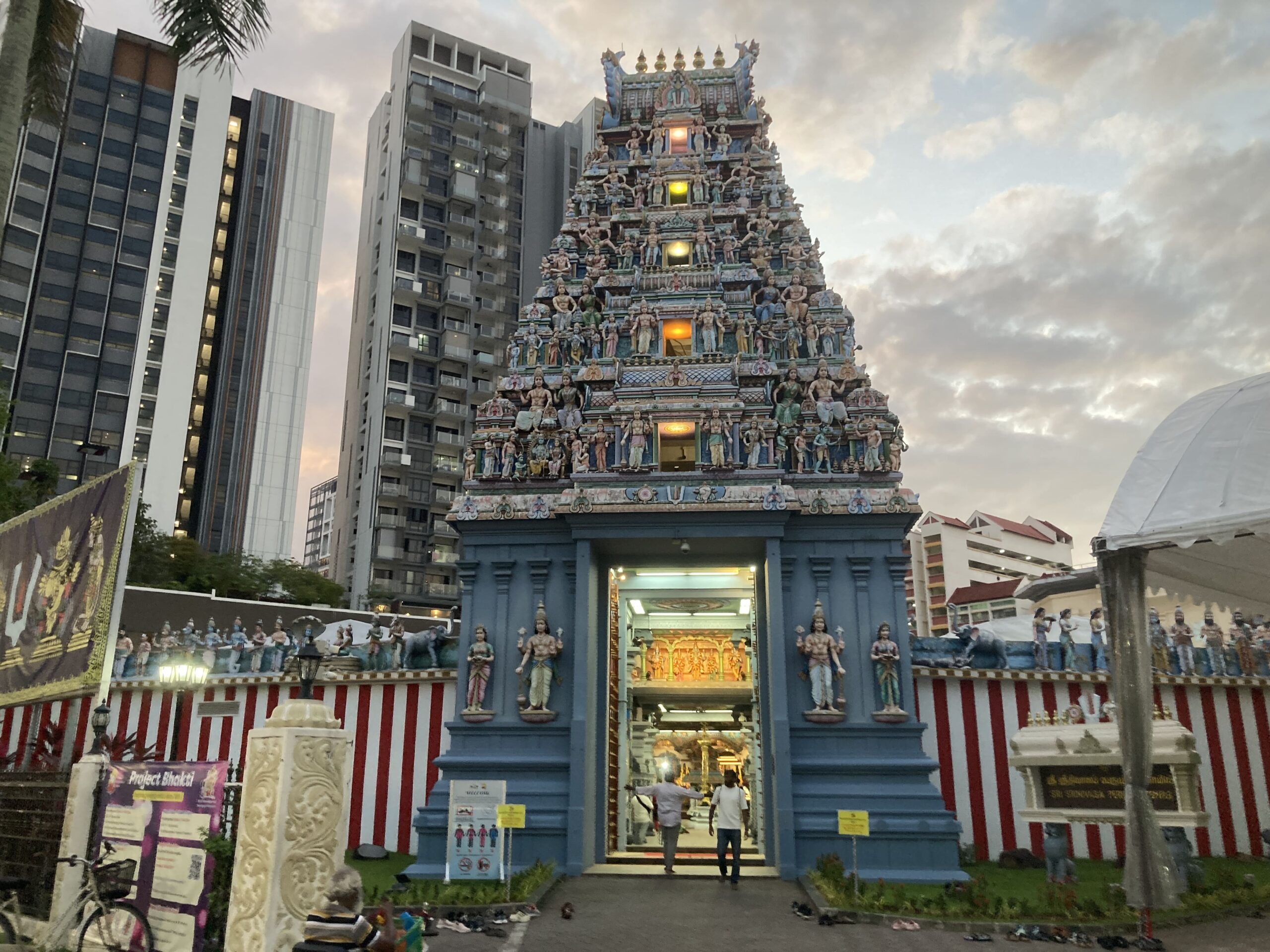 日が暮れる前にホテル周辺を散歩。スリ・スリニヴァサ・ペルマル寺院とスリ・バダパティラ・カリアマン寺院を見学。夕暮れの空に映えるヒンドゥー建築が印象的でした。