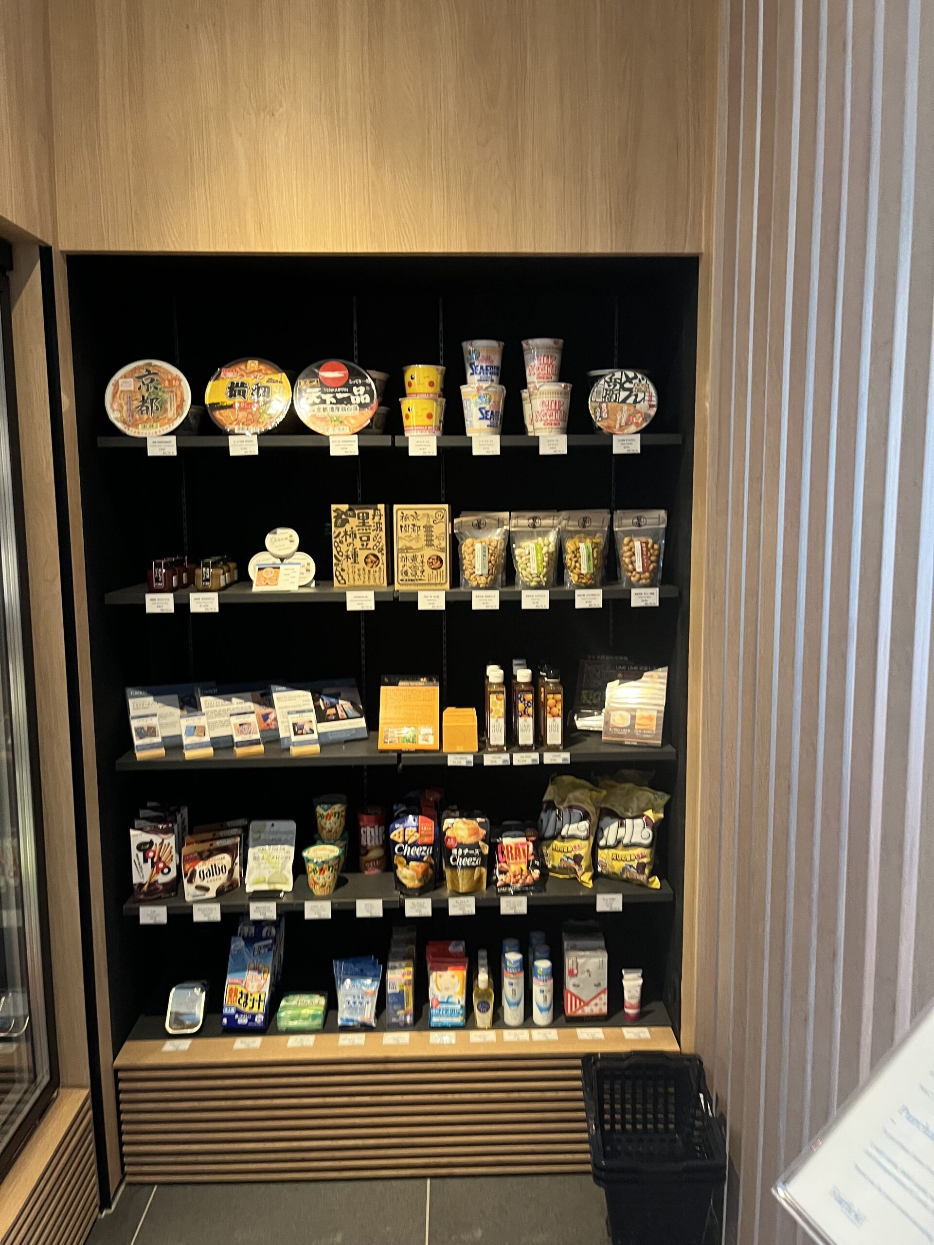 フロントの後ろ側には小さな売店コーナーもありました。アルコールやソフトドリンク、カップ麺やお菓子、それからちょっとしたお土産まで並んでいて、見ているだけでも楽しいんです。しかも24時間利用できるので、夜にちょっと飲みたい時や小腹が空いた時にもとても便利でした。