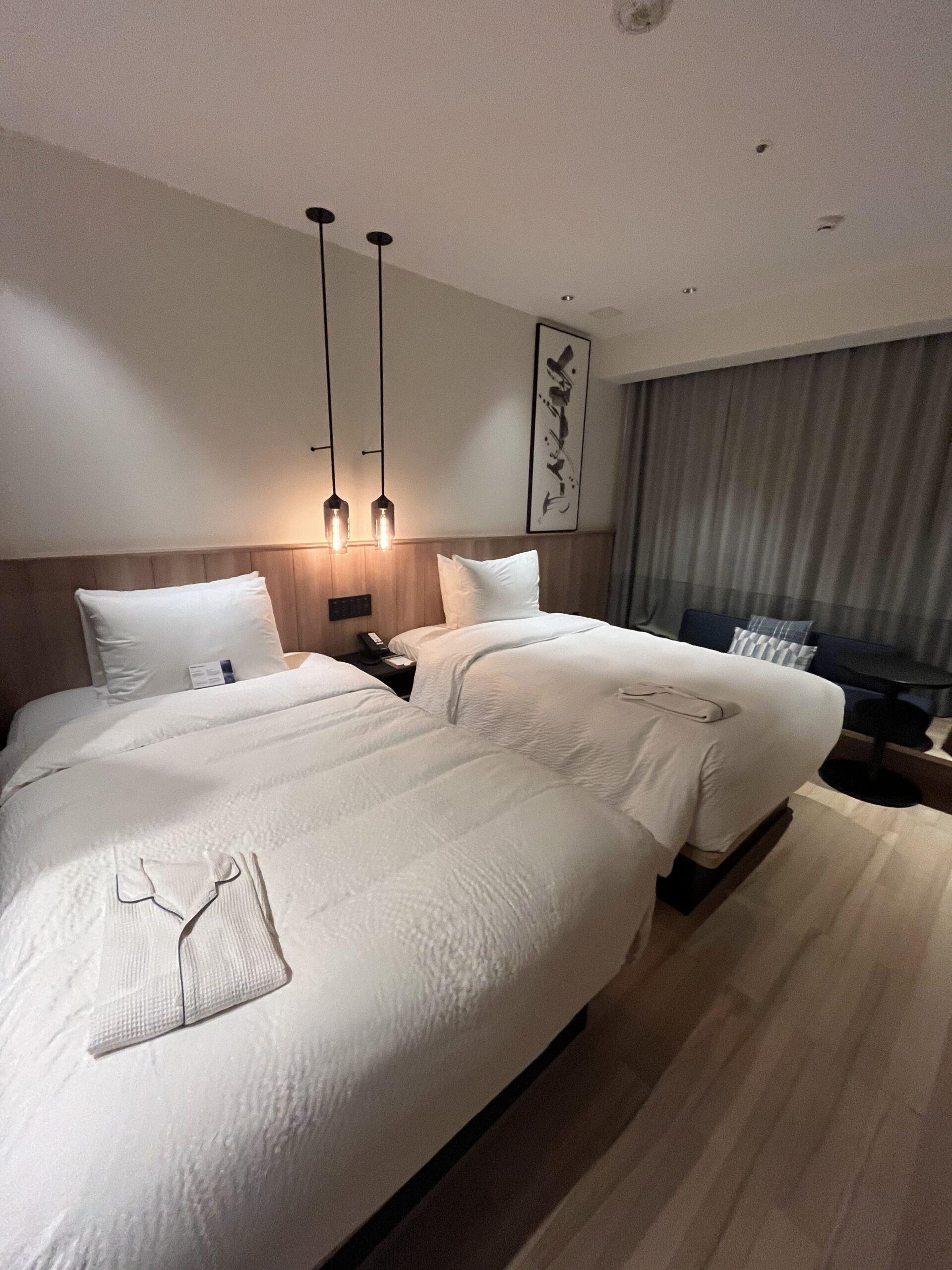 今回利用したのはツインルーム。シングルベッドが2台並んでいて、とても清潔で寝心地も良かったです。マットレスは硬すぎず柔らかすぎず、ちょうどいいバランス。ぐっすり眠れました。