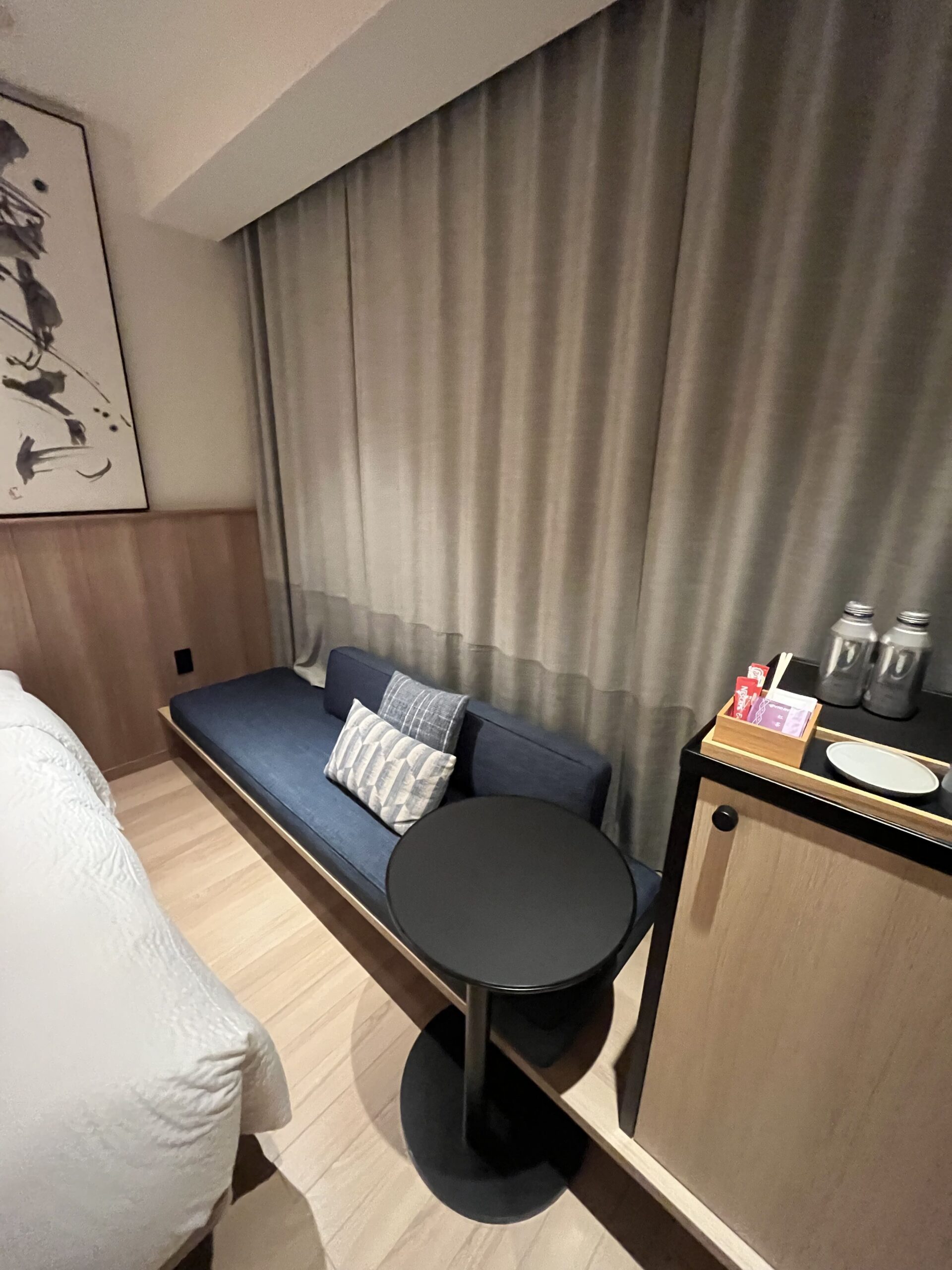 お部屋の設備についてご紹介します。窓際にはゆったり座れる長めのソファがあり、家族でくつろぐのにちょうど良い雰囲気でした(ちなみに、このソファは固定されていて動かせません)。大きな窓からの光を感じながら座れるので、ちょっとした団欒の時間にもぴったりです。