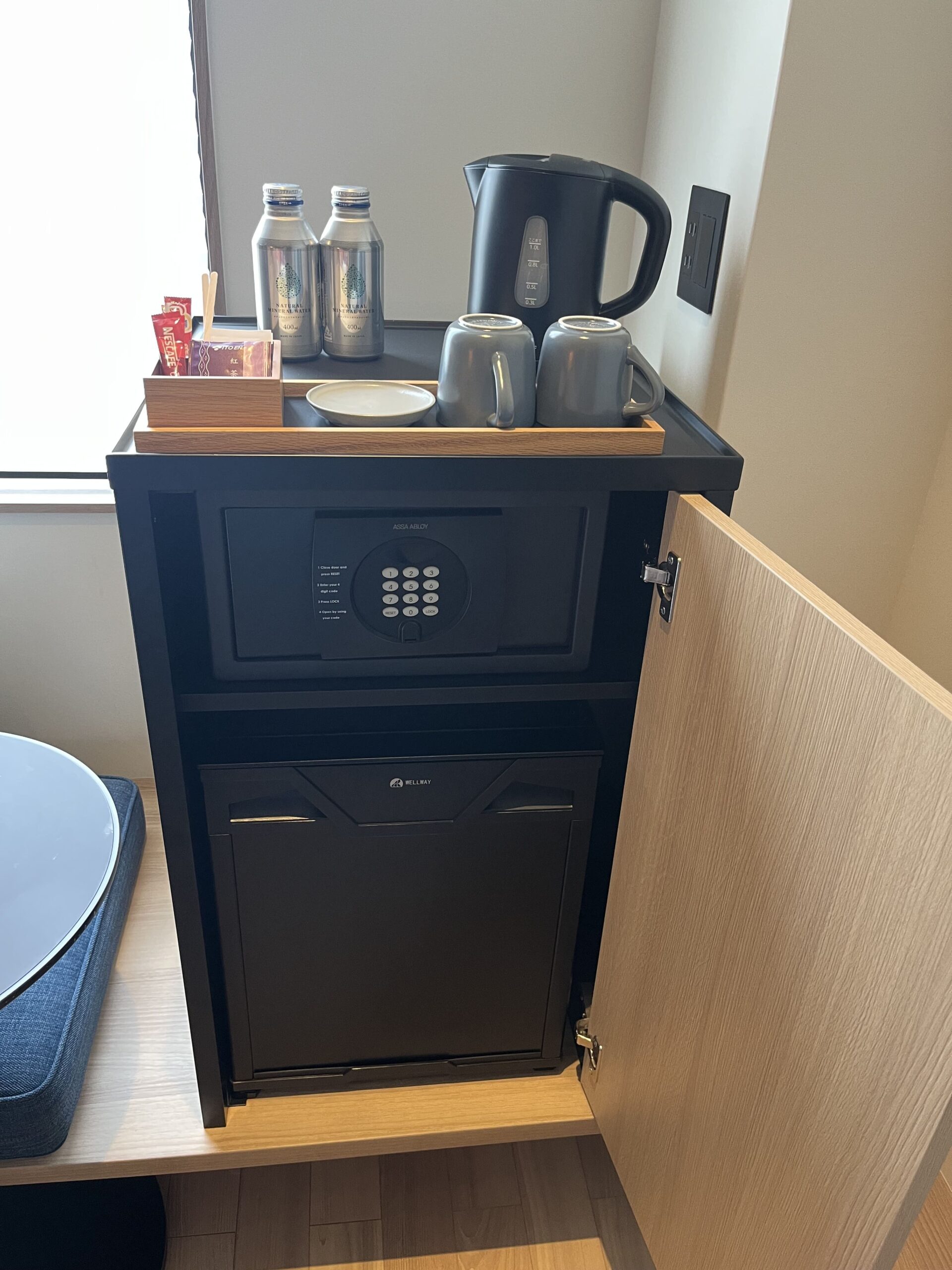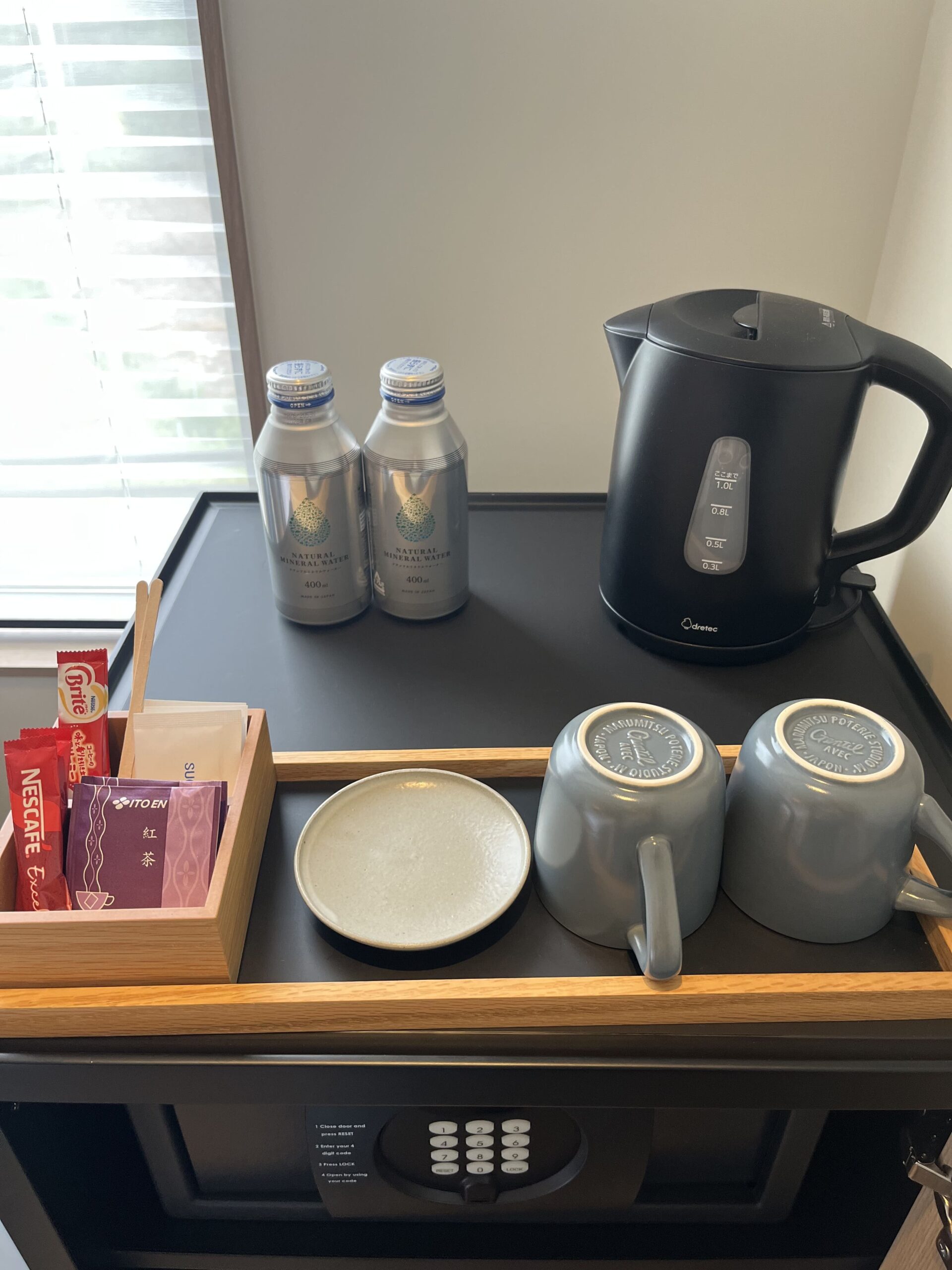 ソファの横には収納棚があり、中には小型の冷蔵庫とセーフティボックス(金庫)が収まっていました。その上には電気ケトルやマグカップ、お茶セットも用意されていて、すぐにお茶を楽しめるのが嬉しいポイント。さらに人数分のミネラルウォーターもいただけて、今回は1泊1人につき400mlほどのボトルが1本ずつ用意されていました。
