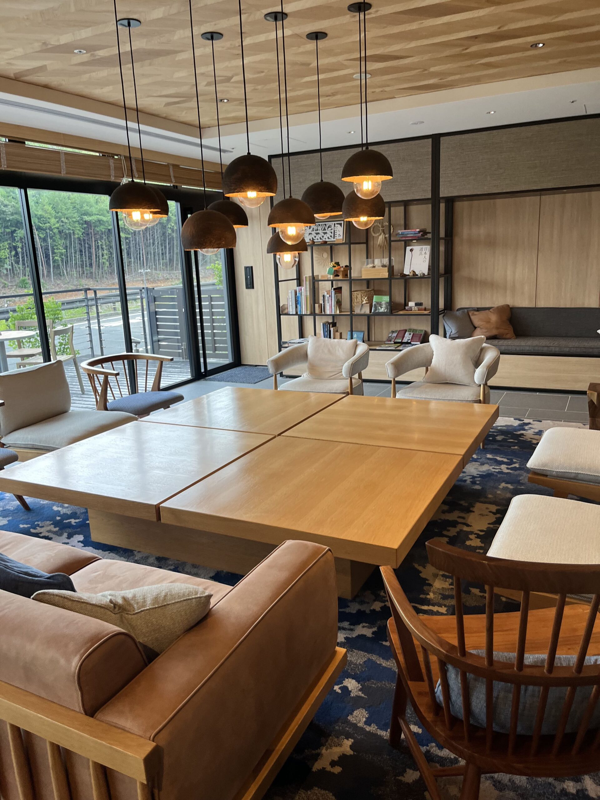 FF京都京丹波にはエグゼクティブラウンジのような特別な施設はありませんが、1階のロビーエリアに宿泊者なら誰でも利用できるラウンジ兼共用スペースがあります。電子レンジやシンク、小さな調理スペースまで整っていて、テイクアウトしたお料理を温めたり、簡単なスナックを用意したりするのにとても便利。テーブル席やソファ席もあるので、お部屋で食べる代わりに気分を変えてここで食事を楽しむのもおすすめです。