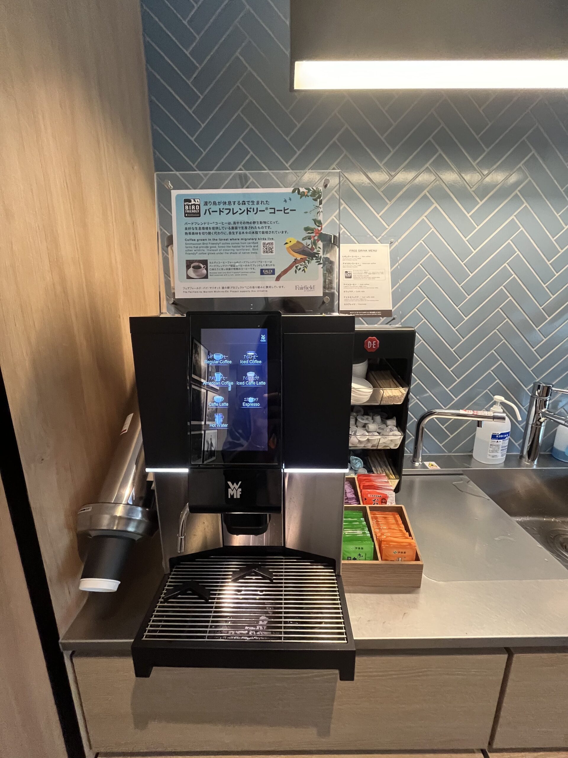 さらに嬉しかったのが、24時間いつでも利用できるコーヒーサーバー。コーヒーやカフェラテを無料でいただけるので、朝の一杯や食後のひと息にぴったりです。紅茶や緑茶のティーパックが用意されていました。お湯とカップさえあればすぐ飲めるので、寒い朝やちょっと小腹が空いたときにもほっとできる心遣いがありがたかったです。訪れたのは残暑の厳しい時でしたので、氷があるのがありがたかったです。