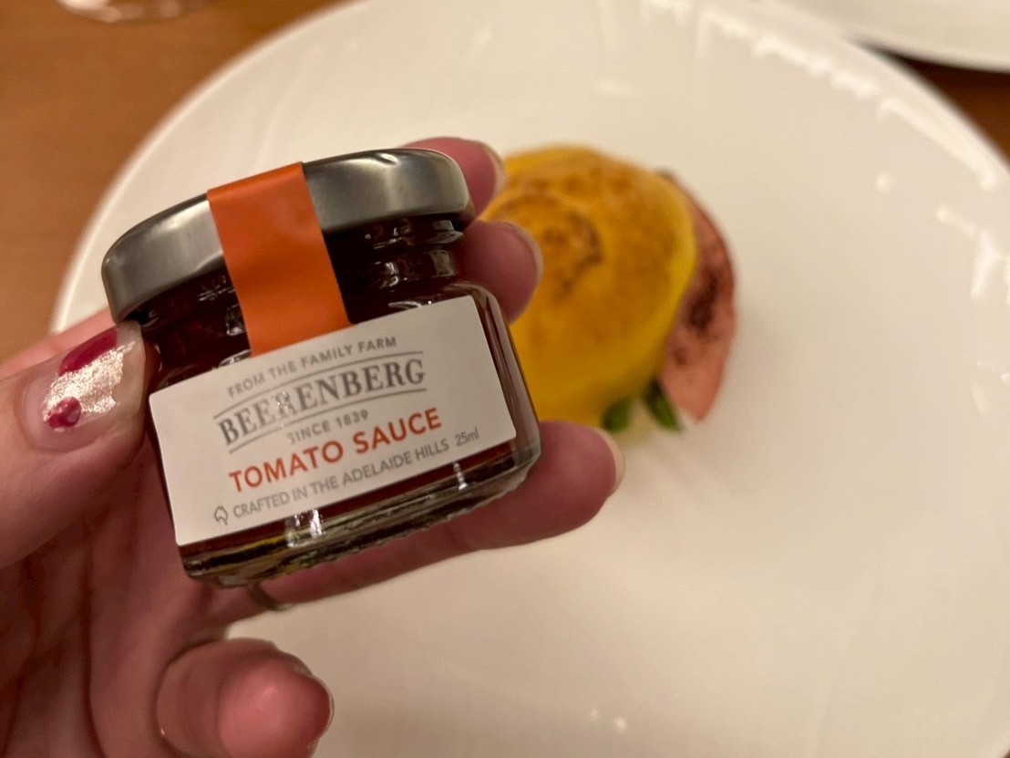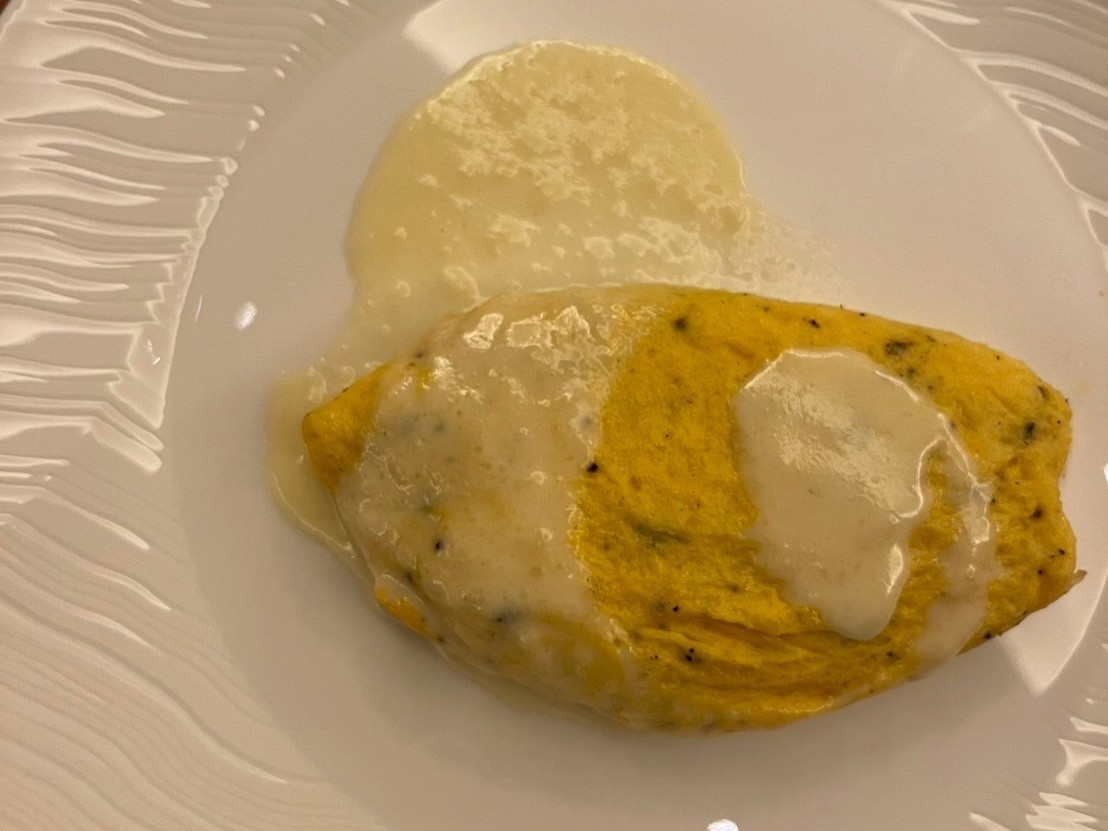 席に案内されたら最初に卵料理をオーダーし、その間にビュッフェ台を取りに行く流れでした。卵料理はオムレツ(プレーン/チーズ/トリュフ)とエッグベネディクトの4種類から選べます。今回は写真のチーズオムレツ(白いクリームソース)とエッグベネディクトをそれぞれいただきました。香りが立つトリュフにまろやかなソースがよく合い、エッグベネディクトは濃厚なソースと焼き目が食欲をそそります。テーブルにはBEERENBERGのトマトソース小瓶もあり、味変ができて最後まで飽きません。