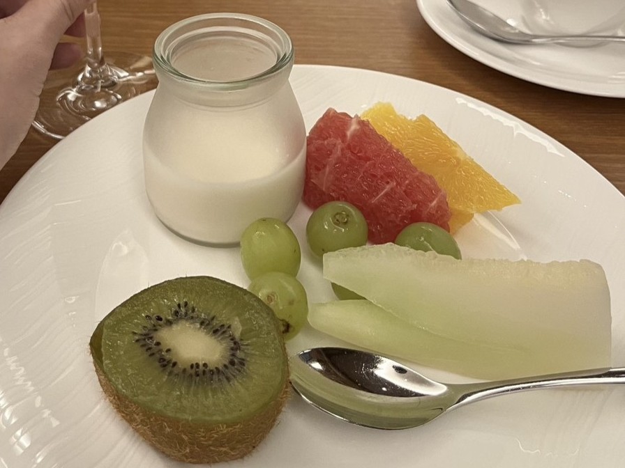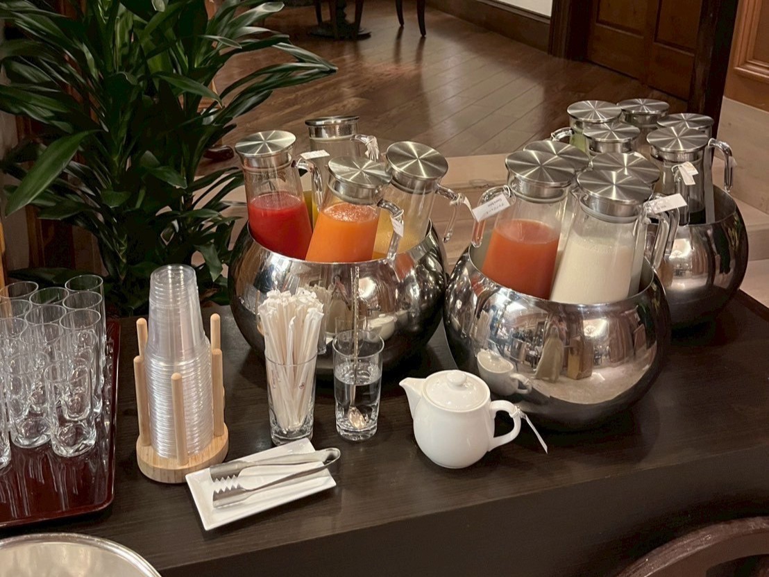 フルーツ&シリアルも充実しており、メロン・スイカ・オレンジ・ぶどうのカットフルーツに加えて、ヨーグルトの小瓶やグラノーラ/ミューズリーなどのシリアルが複数種類そろいます。飲み物はドリンクバー形式でした。オレンジ/グレープフルーツ/トマトジュース、牛乳、アイスコーヒーなどのピッチャーがあり、コーヒーマシンでホット/アイスのレギュラーやアメリカンを選べます。