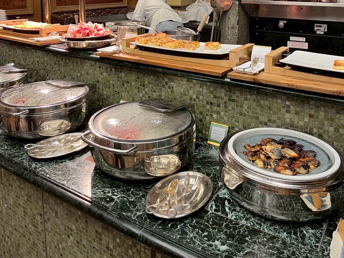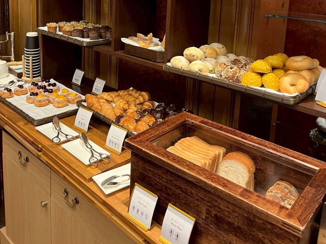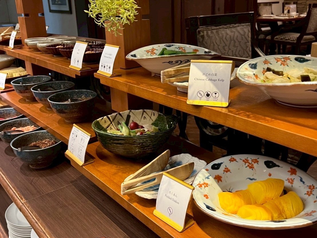 ビュッフェ台は洋食・和食ともに選択肢が多いと感じました。温菜コーナーでは窯で温めたピッツァやホットディッシュが提供され、和惣菜や漬物も用意されていました。ベーカリーコーナーにはクロワッサン、デニッシュ、ベーグル、食パンが並んでいました。