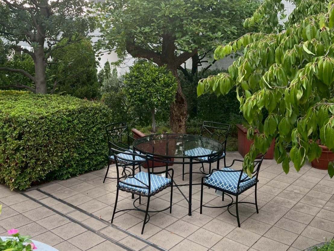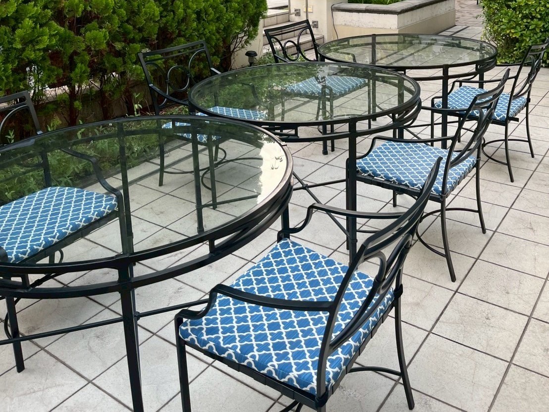 プールサイドにはおしゃれなストライプ柄のリクライニングチェアが並び、読書をしたり、ジャグジー後に涼んだりするのにもぴったり。外にはテーブルと椅子が点在しており、ちょっとしたおしゃべりタイムや休憩にも利用できます。朝の静かな時間にここで過ごすのもおすすめです。