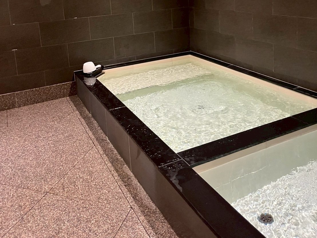 プールで体が冷えたら、浴場でしっかり温まれます。大人でも「熱っ!」と感じるほどの熱めのお湯が特徴で、短時間の入浴でもしっかりと温まることができます。浴場内には冷水風呂もあり、交互浴を楽しむ方にも最適です。サウナは木製のベンチが2段になった造りで、複数人でもゆったり座れる広さがありました。タオルがあらかじめ敷かれているなど、清潔感のある環境です。雰囲気的にしっかりと汗をかけるタイプのサウナでした