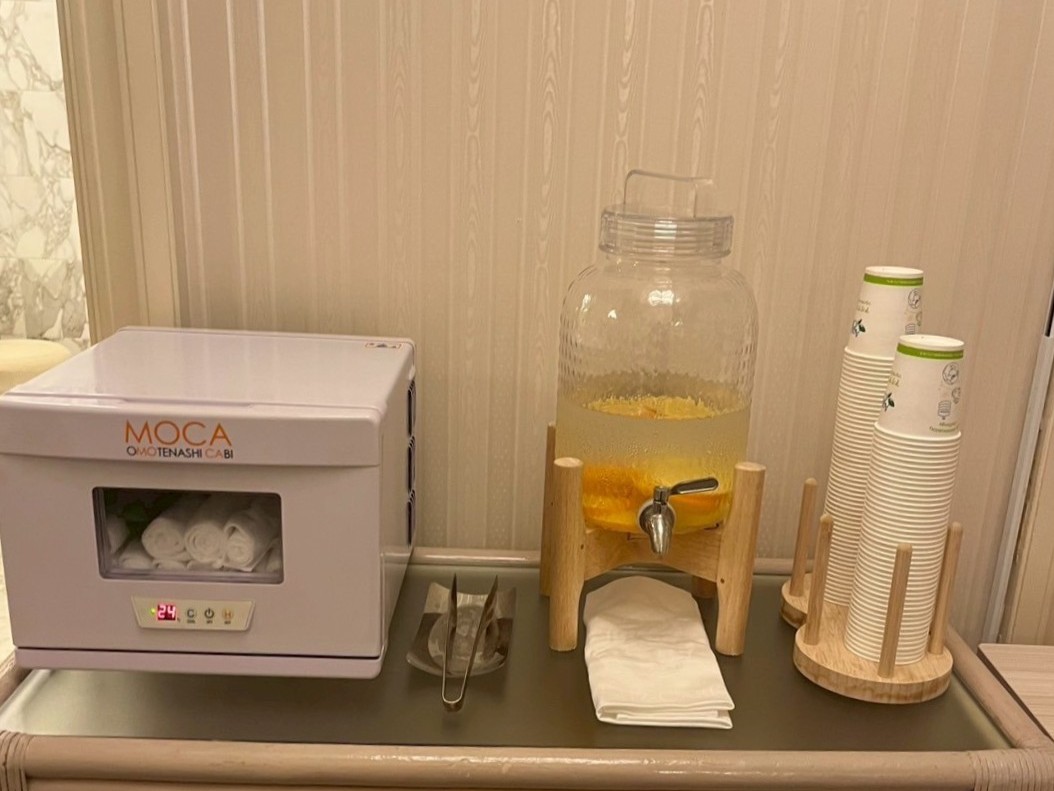さらに、嬉しいサービスとして温かいおしぼりの提供や、脱水機、スリッパも用意されていました。アメニティの補充もこまめに行われているようで、不自由なく利用できます。さらに嬉しかったのが、ペットボトルがたくさん用意されていました。