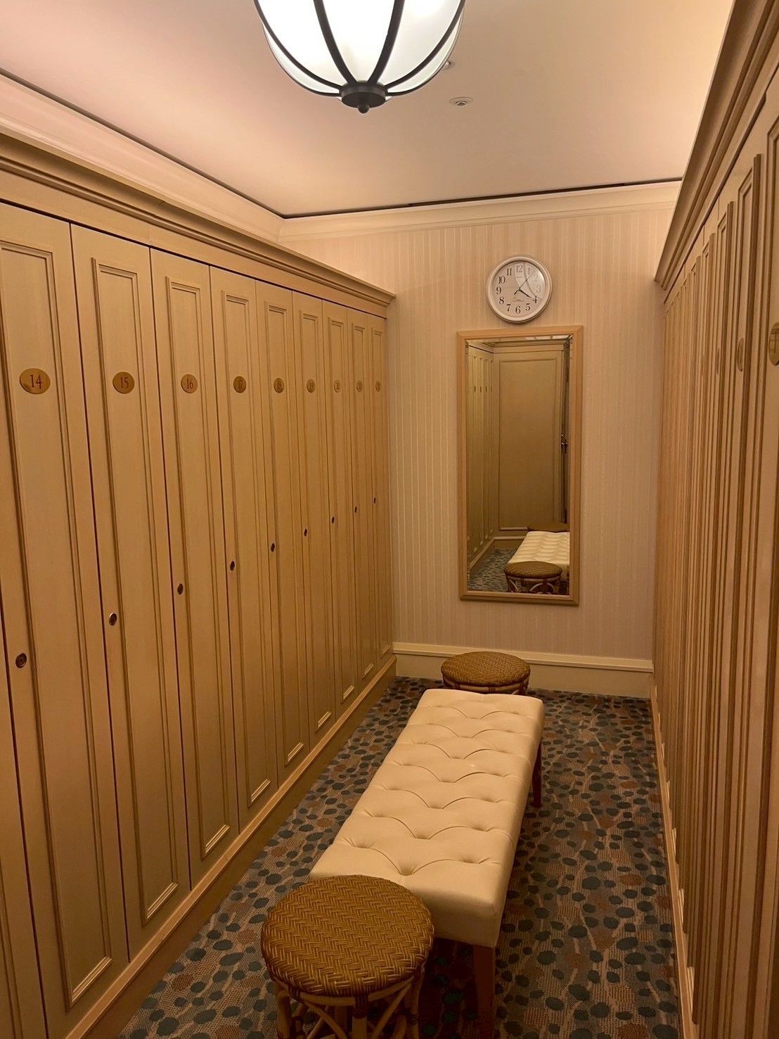 木目調で統一されたロッカールームは、ふかふかのベンチやラタン調のスツールが並び、クラシカルかつ落ち着いた雰囲気。清掃も行き届いており、滞在中ずっと気持ちよく利用できました。